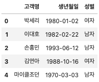 '생년월일': ['1980-01-02', '1982-02-22', '1993-06-12', '1988-10-16', '1970-03-03'],