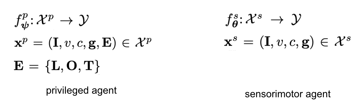 privileged agent로부터 knowledge distillation을 받아 sensorimotor agent가 학습하게끔 한다. privileged agent는 환경정보(E)인 BEV(Bird's Eye View)에 접근할 수 있으며, 여기에는 중앙선, 물체 위치(자동차, 보행자 등), 신호등 위치 등의 데이터가 포함된다. 이를 통해 sensorimotor agent는 K개의 waypoints를 예측하고 학습한다.
