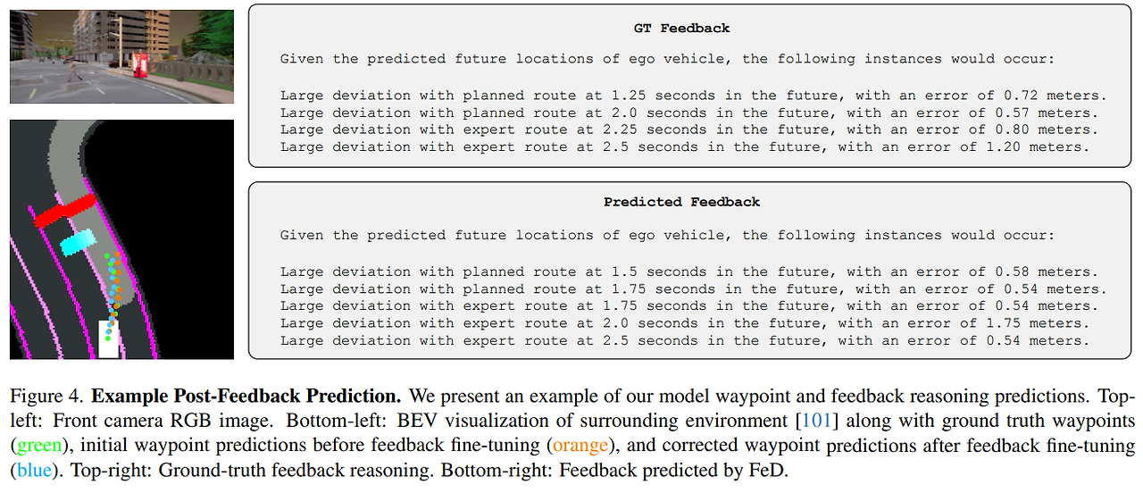 FeD는 느리고 계산비용이 많이 드는 기존의 LLM 기반 방법들과 비교하여 효율적인 폐쇄 루프 평가를 가능하게 한다. 또한 privileged agent로부터 BEV(Top-Down View) 장면 정보와 함께 distillation(증류)를 통해 학습한다. 이를 통해 주변 환경의 정보를 보다 효율적으로 활용할 수 있습니다. FeD은 자신의 실수를 바탕으로 더 잘 학습할 수 있도록, 세부적인 수정 피드백을 사용하여 원인을 알려준다. closed loop 시뮬레이션과 open loop 실제 환경 평가에서 모두 최신 성능을 달성했다.