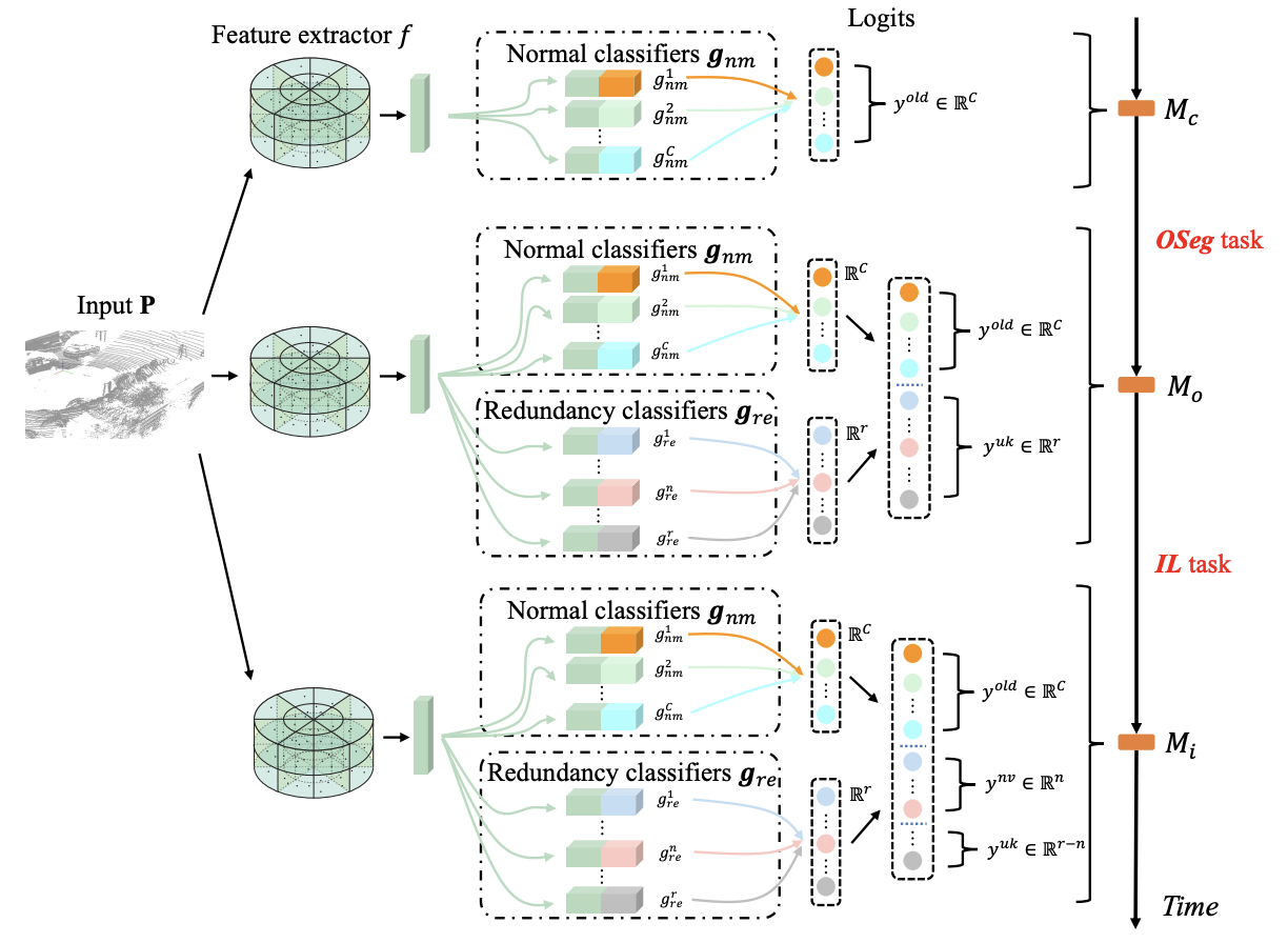 따라서 저자들은 OSeg와 IL task 모두를 해내기 위해 동적인 분류 아키텍처를 가지는 REdundAncy cLassifier(REAL)를 제안한다. OSeg task는 unknown class를 예측하기 위해 기본 network를 기반으로 여러 redundancy classifier(RCs)를 추가한다. 그러면 IL task동안, 여러 RCs가 새로운 class에 대해 학습하고 남은 RCs는 여전히 unknown class를 담당한다.