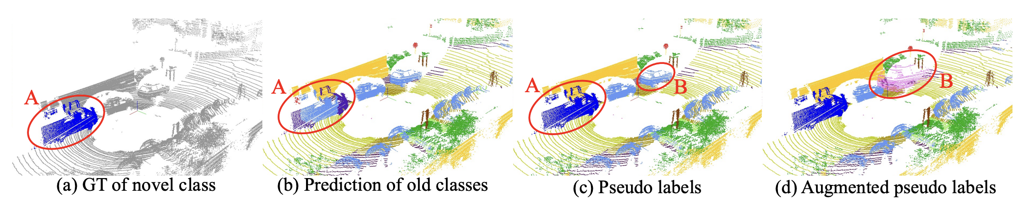 Figure 4 (c)와 같이 전체 point cloud Ynm의 pseudo label을 생성하기 위해 pYold와 Ynv를 합친다. Ynm에는 새로 발견한 Kn과 old class K0가 합쳐지기 때문에 Mi는 old class를 잊지 않고 새로운 class를 배울 수 있다.