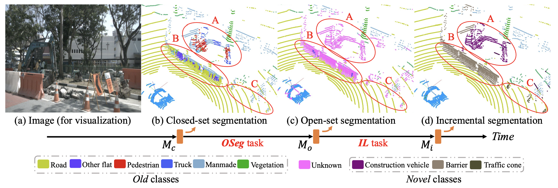 현재 존재하는 LIDAR semantic segmentation 방법은 모두 closed-set, static하다. 모든 입력에 대해 closed-set network는 학습동안 발생한 카테고리로 할당한다. 따라서 기존 class의 라벨은 novel class에도 잘못 배정하여 자율주행같은 안전에 예민한 상황에 재앙적인 결과를 가져올 수 있다. 한편 static network는 새로운 환경에 적응하기 위해 스스로 업데이트하지 못하기 때문에 특정 상황에 제한적이다. 또한 새로운 장면에 대해 적응하기 위해 처음부터 학습시키는 것은 시간소요가 많이 되고 privacy문제로 기존의 class의 annotation은 가끔 불가하다.
