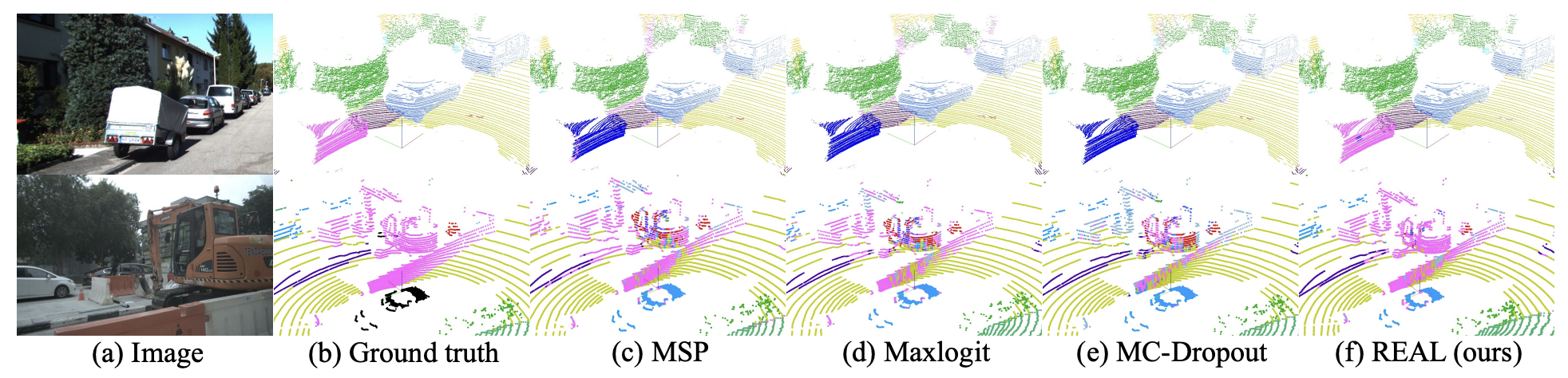 3D LIDAR point cloud OSeg task가 없기 때문에 2D task를 참고해야 하는데, generative network 방법과 uncertainty 방법 2가지가 있다. generative network방법은 conditional genrative adversarial network(cGAN)을 채택했으나 point cloud reconstruction에는 적합하지 않다. point cloud는 모든 정보가 geometry 정보로 결정나는데, cGAN는 geometry 정보는 변경하지 않으면서 channel 정보(RGB값)만 reconstruct할 수 있기 때문이다. uncertainty 방법 또한 Figure 3.(a)와 같이 novel한 class를 old class로 높은 confidence 점수로 예측하고 있기 때문에 적합하지 않다. (novel class가 unknown class에 낮은 MSP(Maximum Softmax Probability)를 가진다는 것은 closed-set prediction에서 novel class가 old class로써 높은 confidence로 분류된다는 것을 의미한다.)