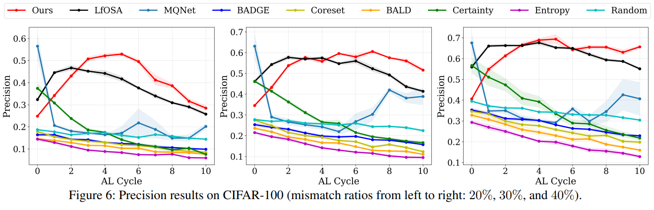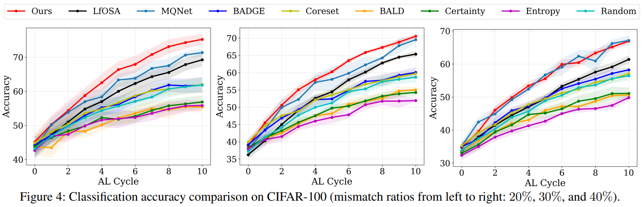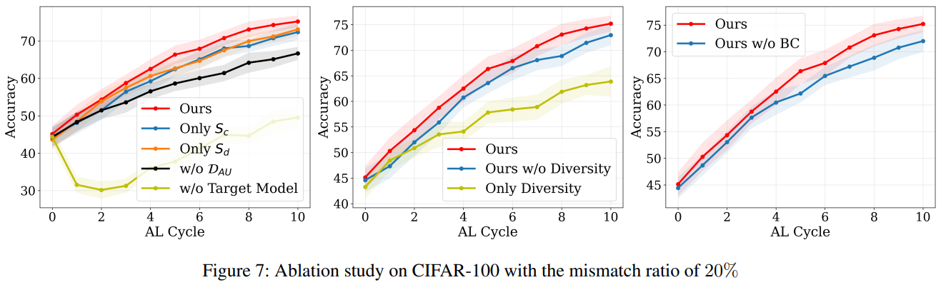 본 논문에서 known, unknown class 분포를 활용한 open-set active learning 문제를 다루는 novel framework를 제안하였다. 이는 known category 분포에 대해 불확실성을 정량화한 closed-set entropy와 unknown category 분포에 대해 불확실성을 측정하는 distance 기반의 entropy를 활용하였다.