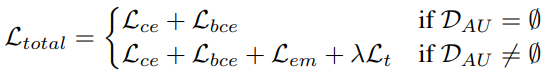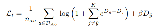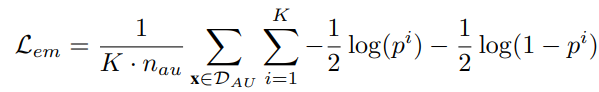 이 때 nau는 한 배치의 active unknown sample 수이며, 해당 loss는 unknown sample에 대한 확률출력이 p=[1/2, 1/2]로 균등하게 하기 위함이다. (첫번째, 두번째 항이 1/2에 가까워지도록 학습하여 균등하게 분포하도록 만든다.)