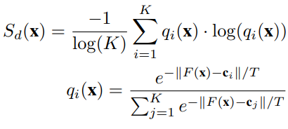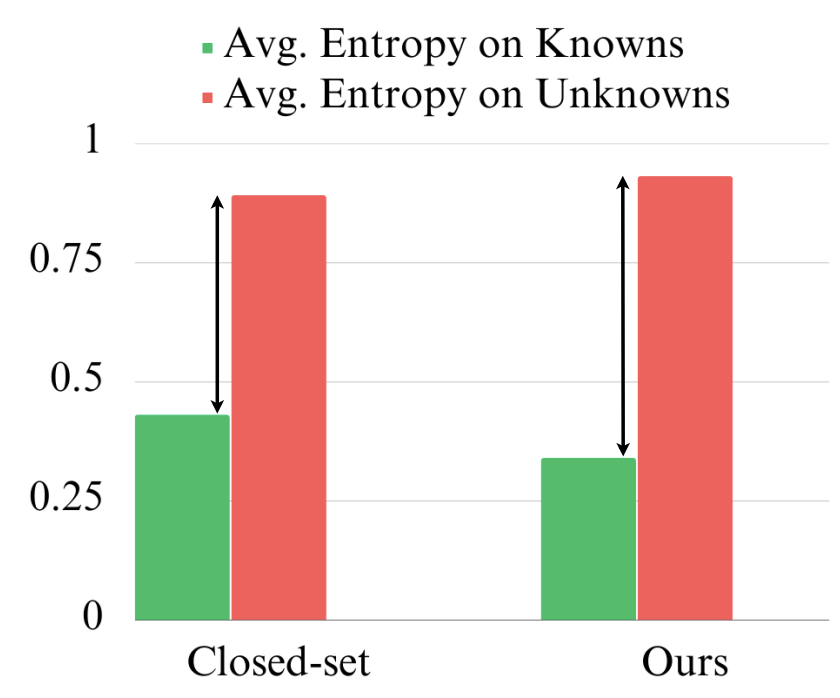 식 1과 같이 학습할 때, known sample에 대해 low entropy를 보장하지만, unknown sample에 대해서는 high entropy를 보장할 수 없다. 따라서 unknown sample의 높은 Sc를 보장하기 위해, 아래의 loss를 최소화하였다.