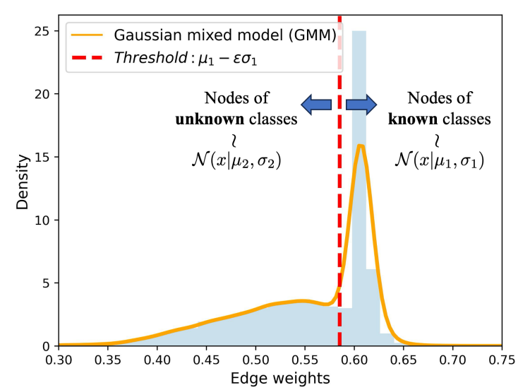 Figure 3과 같이 unknown class가 낮은 불확실성 점수를 가지고 known class가 높은 불확실성을 가진다는 점을 생각했을 때 known class의 노드들은 unknown class의 노드보다 큰 경계가중치를 가지고 있을 것이다. 높은 가중치를 가지는 경계를 잘랐을 때, 대부분의 노드는 known class를 고립시킨다. 반대로 unknown class는 여전히 대부분의 경계를 보존하고 있어 쉽게 구분이 된다. 경계가중치의 전반적인 분포를 gaussian mixed model(GMM)을 활용하여 맞추었다.