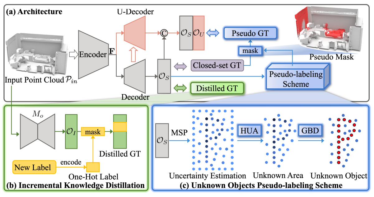 IL task를 위해 point cloud는 Mo와 MI로 입력되고 OI와 OS가 출력된다. OS는 distilled GT로 supervise되고 이는 OI와 novel class label로터 생성된다.