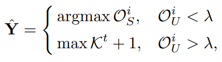 pseudo labeling scheme의 목적은 U decoder의 불확실성 출력 OU를 supervise한 probability output Os를 활용하여 unknown class의 pseudo label 생성하는 것이다. figure 2 (c)와 같이, known의 예시는 maximum softmax probability(MSP)가 unknown보다 높게 나타난다. 저자들은 이 MSP를 활용해 불확실성 점수 S를 계산한다.