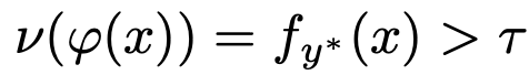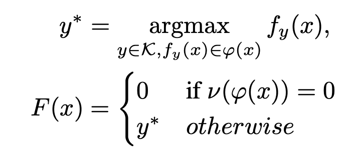 Eq6, 7은 novelty detection 과정으로 y는 f(x) 값 중 가장 높은 f(x)값을 가지는 클래스이며, Eq 6에는 v(ϕ)=0이어야 unknown 클래스라고 되어 있지만 임계값 τ를 넘지 못해도 unknonw으로 취급한다.