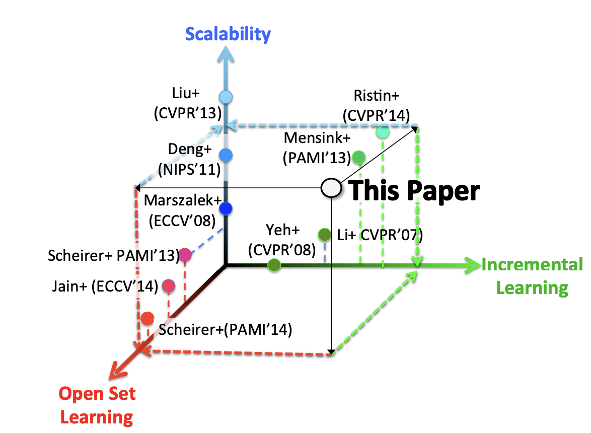 real world에서 recognition은 조절되어있는 실험실 환경에서 나타나지 않는 challenge들을 가진다. dataset은 dynamic하고 novel category는 계속해서 탐지되고 추가되야 한다. 이러한 문제들을 다루기 위해 저자들은 Open World recognition을 제안하고 정의한다. open world recognition system을 평가하기 위한 protocol과 객체의 카테고리를 점차 추가하고 모델을 효율적으로 진화시키는 NNO(Nearest Non-Outlier) 알고리즘을 제시한다.
