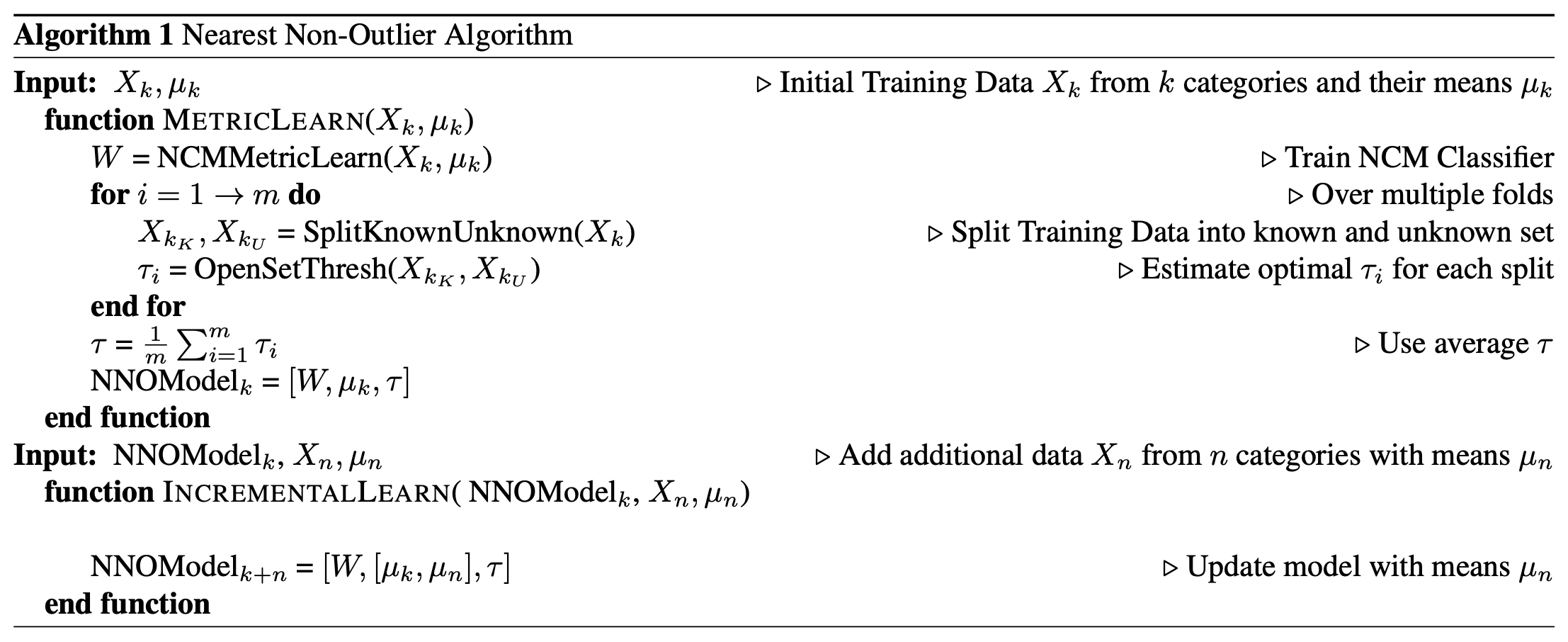 모든 class를 known으로 가정하는 probability normalization을 사용하려 했으나 unknown class를 포함하는 open world recognition에는 적합하지 않다. 특히 total probability, Bayes' Law는 적용에 한계가 있다. 또한, class가 추가될 때마다 normalization factor, probability가 변하기 때문에 propbability해석에 제한이 있다. 이러한 문제를 해결하기 위해 Nearest Non-Outlier(NNO)알고리즘을 제안한다.