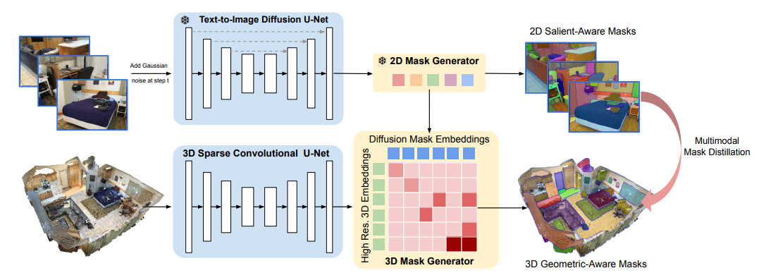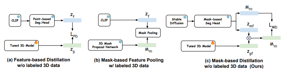 3D perception에서 중요한 challenge는 poin clouds와 dense label 데이터가 부족하다는 것이다. 이러한 문제를 CLIP을 이용한 zero-shot으로 많이 해결한다. 그러나 CLIP은 diffusion에 비해 fine-grained하고 localization 능력이 부족하다. 따라서 저자들은 diffusion과 mask 기반 segmentation head (Mask2Former)를 backbone으로 활용하여 mask와 semantic representation을 분리하는 방법을 제안한다. 이는 2D foundation model의 semantically rich 임베딩을 활용하여 3D branch의 geometrical 정확성 mask를 학습하는데 적합하다. 그러나 mask기반 segmentation head를 사용해 multi modal distillation을 행하는 것은 간단한 작업이 아니며, diffusion모델은 생성 목적으로 학습되어있기 때문에 추출된 frozen feature를 직접적으로 perception task에 활용하는 것은 불가능하다. 그래서 3D mask network로 mask를 예측하고 2D CLIP feature에 각 mask를 활용한다. 그러나 이를 위해서 3D label 데이터가 필요하며, 이 데이터가 부족하기 때문에 비현실적이다.