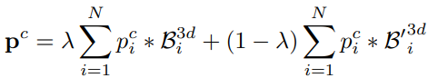 inference할 때는 Diff2Scene에 3D point cloud와 multiview 2D image가 입력된다. 2D semantic understanding model이 2D image를 이용하여 2D probabilistic mask와 mask embedding을 생성한다. 3D mask model은 3D point cloud과 mask embedding을 입력 받아 3D probabilistic mask를 예측한다. 3D poinc cloud의 label c를 예측하기 위해 각 2D mask를 diffusion과 discriminative model을 이용하여 label probability의 geometric mean을 계산한다. 그 후 아래 식을 이용해 label probability를 계산한다.