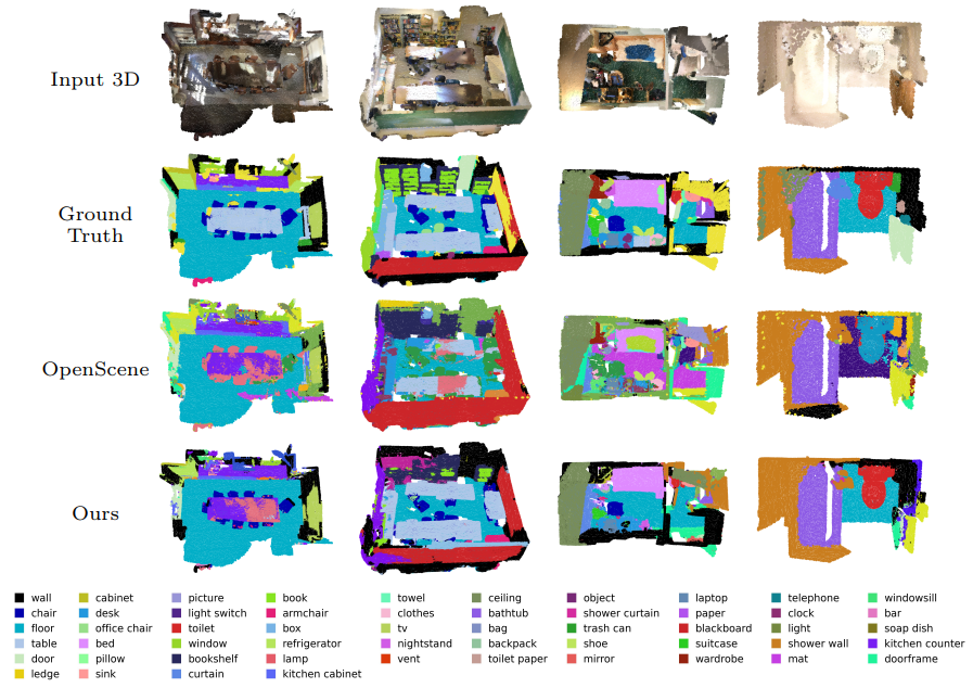 open vocabulary task는 카테고리, 세부속성(모양, 색상, 재질 등), 복잡한 조합까지 text로 설명된 모든 semantic을 예측할 수 있어야 한다. 그러나 이는 쿼리의 다양성과 복잡성 때문에 challenging한 일이다. 이를 해결하기 위해 text와 image가 embedding된 CLIP같은 대형 foundation model에서 image feature를 3D로 끌어올린다. 이는 3D semantic understanding의 성과를 내지만 세밀한 class나 새로운 text query를 처리하는데 한계가 있다.