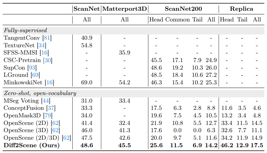 image-caption 쌍의 large-scale로 pre-train한 diffusion model을 사용하여 open vocabulary 3D semantic understanding을 위한 Diff2Scene를 제안한다. 이는 object, 외형, 재질, 위치, 구성요소 등을 효과적으로 구분하며, SOTA 성능을 달성하였다.