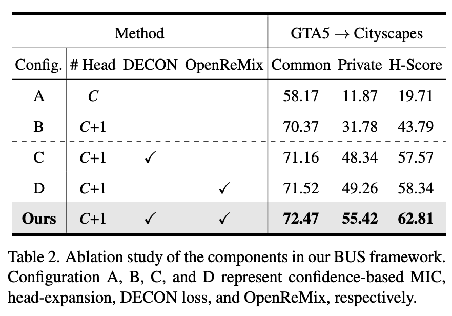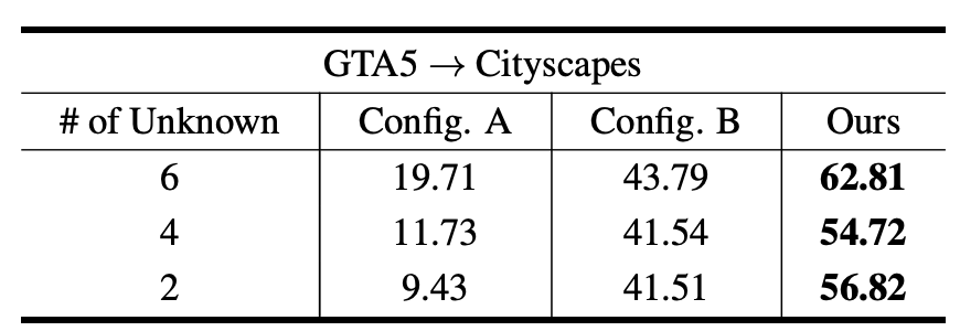 OSDA-SS task를 해결하기 위해, DECON loss, dilation-erosion-based contrastive loss를 포함한 BUS를 제안한다. 또한, size-invariant feature를 학습하고, target의 unknown object를 source에 섞음으로써 expanded head에서 잘 학습하는 OpenReMix 방법을 제안한다. 해당 방안들은 상당히 좋은 성능을 보이지만, pseudo-labeling기반의 방법이어서 calibration이 힘들다. 따라서, calibration이 잘 되지 않는다면 private class의 픽셀을 unknown으로 배정하지 않을 수 있다.