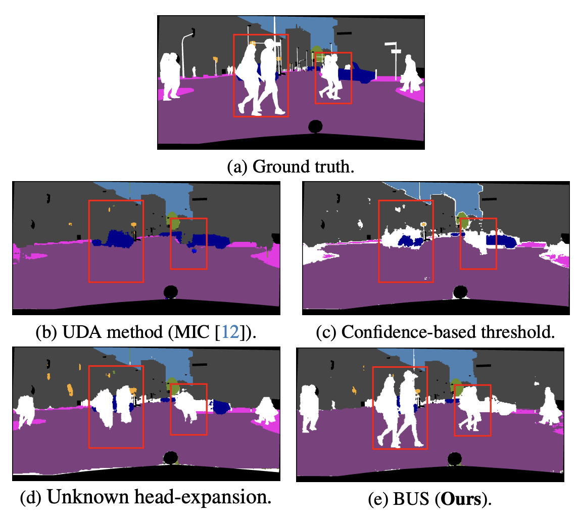 confidence-threshold를 기반으로 UDA 방법을 활용할 수 있다. 학습할 때는 UDA알고리즘을 사용하여 target-private class를 고려하지 않고 inference할 때는 사전에 정의되어있는 threshold 아래의 confidence점수에서 unknown으로 구분한다. classfication head를 known class C에서 C+1로 확장한다. 학습동안, pseudo label을 생성할 때 특정 threshold 이하의 confidence pixel을 C+1로 배열하고, pseudo label과 함께 학습한다. 이는 unknown class를 reject하는데, 성능이 그리 좋지 않다.