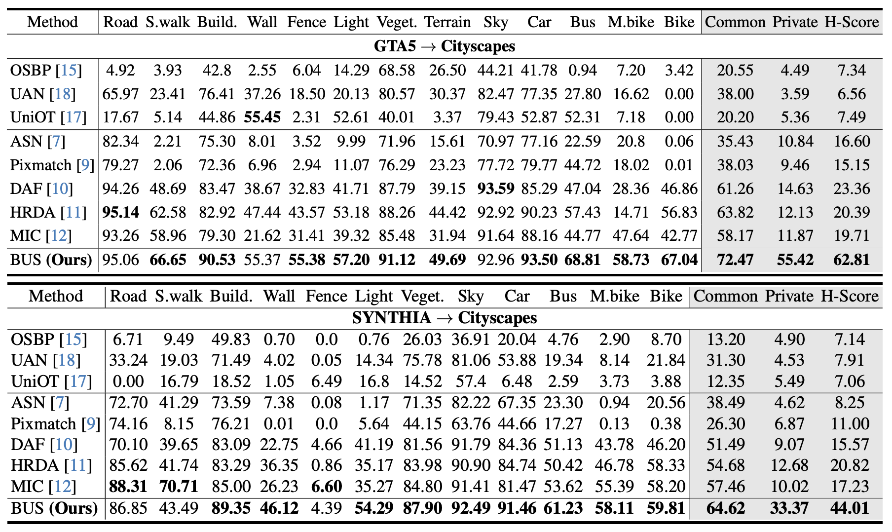 • SYNTHIA: “pole”, “traffic sign”, “person”, “rider”, “truck”, “train”, and “terrain”.