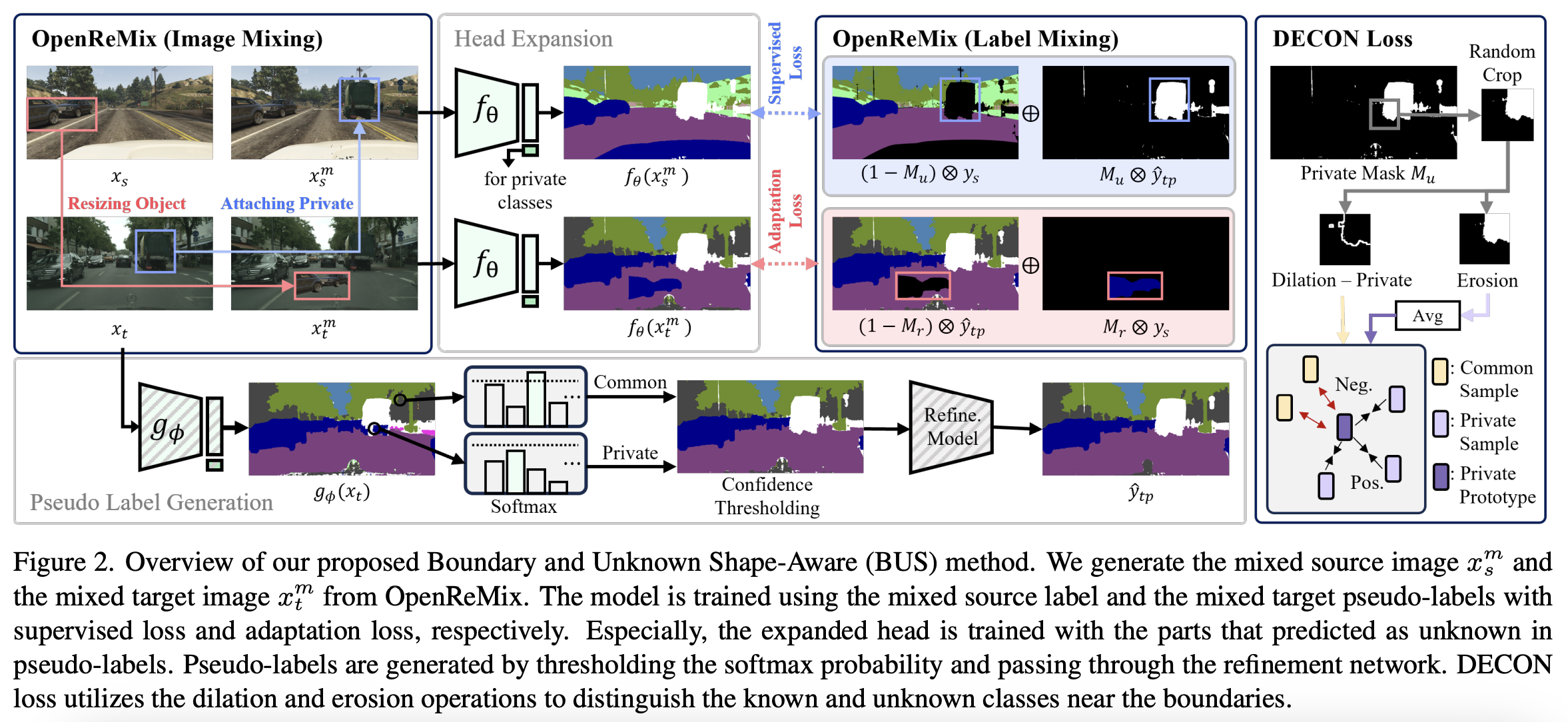 따라서 저자들은 head-expansion baseline을 설계하였다. 2가지 failure mode를 찾았고, Boundary and Unknown Shape-Aware(BUS)를 제안한다. 첫째, 이전의 모델은 object의 경계가까이에서 낮은 confidence를 보였다. 이 문제는 supervision의 부족 때문에 target-private class에서 더 들어난다. 이를 해결하고자, Dilation-Erosion-based CONtrastive(DECON) loss를 제안하며, 이는 dilation(팽창)과 erosion(침식)을 활용한다. target image에서 pseudo-labeling을 사용하여 target private mask를 생성한다. 그 후 팽창된 mask에서 원래의 mask를 빼서 boundary mask를 생성한다. 그리고 private mask에서 erosion(침식)을 가해 더 confidence한 영역을 나타내 침식된 mask를 생성한다. 그 후 positive sample로 erosion mask, negative sample로 boundary mask의 feature를 사용하여 contrastive를 활용해 학습한다. DECON loss는 이를 boundary 근처에서 잘 구별하게 해준다.
