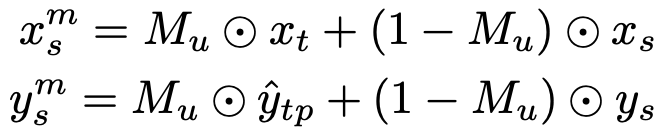 expanded head는 private label를 포함한 target pseudo-label로 학습된다. 하지만 source image에는 private class가 없기 때문에, 추가 head를 업데이트하기 위해 source data를 사용할 수 없다. 이를 해결하기 위해 target private class의 일정 부분을 source image에 붙여넣는다. 식 6으로 만든 target private mask와 target image의 private 영역을 source image에 붙여넣어 private class-mixed source image를 만든다. source label와 target의 pseudo label을 결합하여, mixed source label을 만든다. 이 augmentation은 private class를 reject하기 위한 상당한 양의 dataset을 제공한다. 이는 open-set domain adaptation 성능을 향상시킨다. mixed source image를 만드는 과정은 아래와 같다.