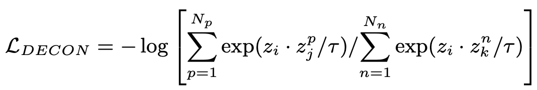 positive sample의 평균값으로 계산한 prototype을 활용하여 anchor(zi)를 계산한다. 이를 이용해 contrastive loss(DECON)를 정의하면 아래와 같다. DECON은 제안한 모델이 boundary 근처에서 common class와 private class를 더 잘 구분할 수 있도록 해준다.