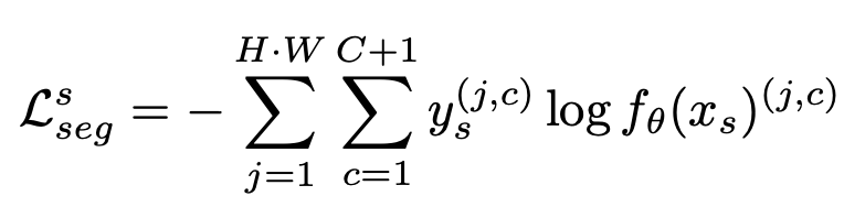 self-training 기반의 UDA 방법에서 영감을 받아, OSDA-SS baseline을 classifier head의 갯수를 C에서 C+1개로 늘렸다. segmentation model f는 labeled source data를 활용하여 cross entropy loss를 따라 학습한다.