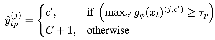 source domain과 target domain의 차를 줄이기 위해 pseudo label을 생성하는 teacher network g를 활용한다. pseudo label은 unknown을 고려하여 아래와 같이 계산한다. maximum softmax probability가 threshold보다 낮으면 unknown class로 낮은 confident pixel로 지정한다. 아래의 pseudo label을 완전히 신뢰할 수 없기 때문에, confident pixel의 비율을 이용하여 pseudo label의 confidence도 계산한다.