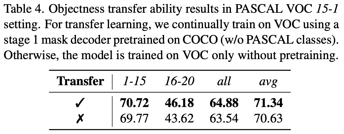 objectness를 이용한 query기반의 segmenter는 pixel단위의 segmenter와 비교했을 때 고유한 장점을 가지고 있다. objectness는 강한 전이능력와 forgetting resistance를 가진다는 것이다. 이를 기반으로 2stage(forgetting-resistant continual
