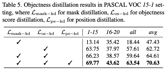 old class의 forgetting을 완화하기 위해 마지막 단계의 출력을 distill한다. distillaion과정에는 마지막 단계의 mask proposal, objectness score, positional embedding이 필요하다.