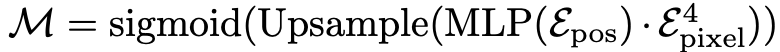 Fig. 2(b)와 같이 objectness learning은 mask decoder에 의존한다. mask decoder는 Transformer layer의 L block으로 이루어져 있으며, N개의 positional queryh와 중간 pixel embedding을 입력으로 사용한다. 그 후 positional embedding을 통해 mask proposal과 objectness socre가 출력되고, stage 2 recognition을 진행한다. mask proposal M은 아래와 같이 계산된다.