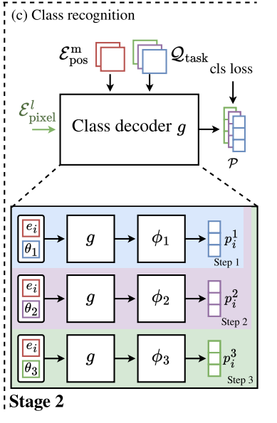 3. positional embedding과 pixel embedding을 결합해 class decoder의 입력으로 사용하여 recognition을 수행한다. task interference를 줄이기 위해, task query와 task specifice classifier는 class knowledge에 특화되도록 학습한다.