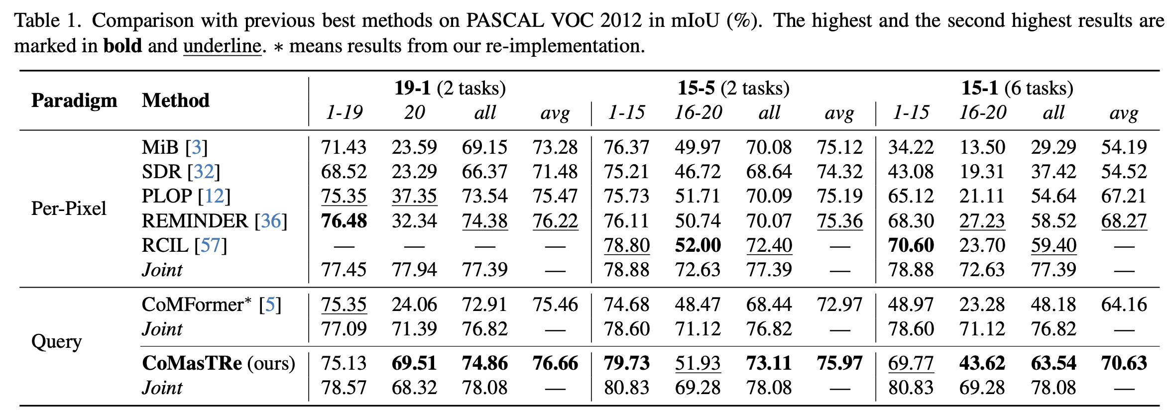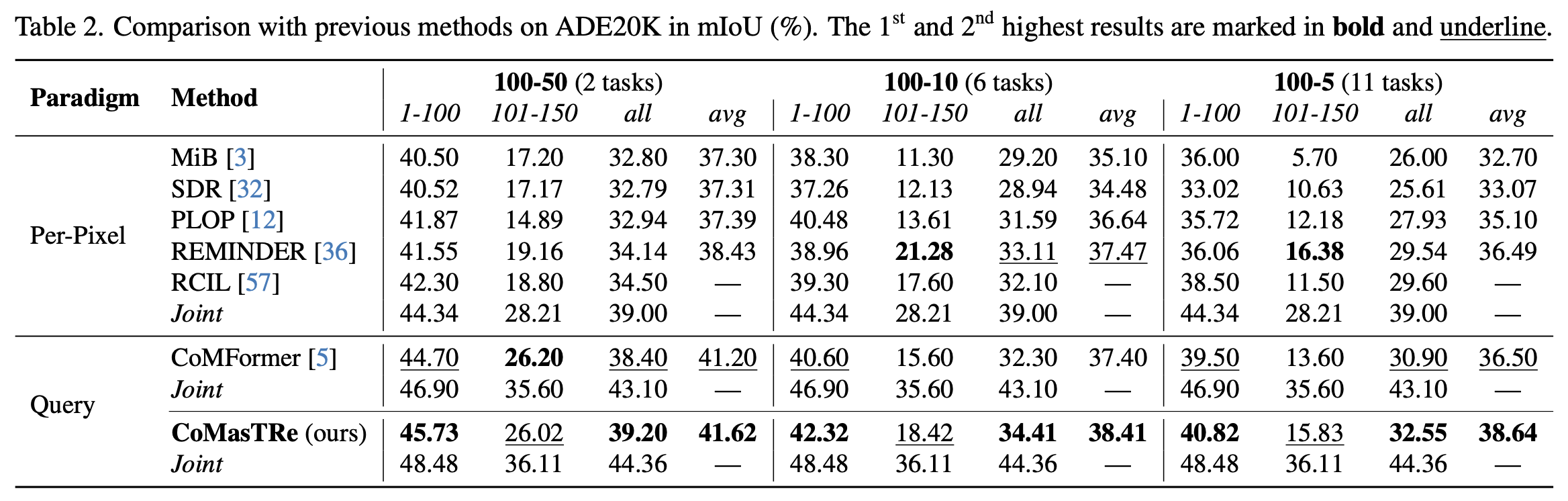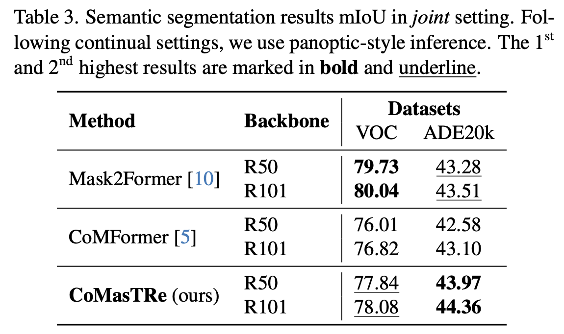 PASCAL VOC 2012, ADE20K 데이터셋에 대해 CoMasTRe는 SOTA성능을 달성하였다.