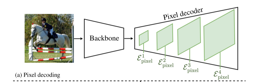 1. image가 입력되면, backbone에 들어가 pixel decoder를 통해 pixel 임베딩을 생성한다. pixel decoder의 4개 레이어에서 각각 pixel 임베딩을 추출한다.