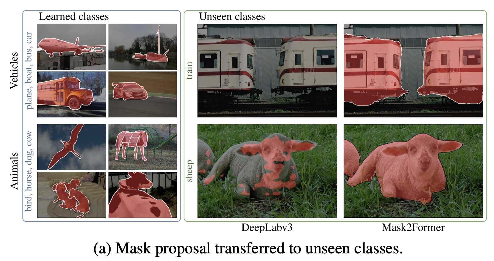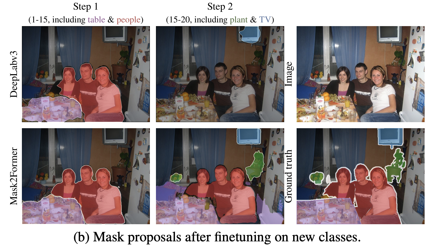 Figure 1(a)와 같이 pixel단위의 DeepLabc3와 query단위의 Mask2Former를 비교해보면, vehicle, plane, buse 같은 비슷한 class를 학습했을 때 새로운 class인 train을 query 단위의 Mask2Former가 mask를 더 잘 만드는 것을 볼 수 있다. 둘째, Figure 1(b)를 보면, old class에 대한 forgetting에 강인하다는 것을 확인할 수 있다.