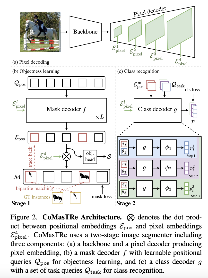 저자들은 objectness와 continual classification연구들을 통해, mask classification을 활용한 continual segmentation문제를 해결하는 것이 유리하다고 주장한다. 따라서 Mask2Former를 활용하면서, objectness learning과 class recognition을 수행할 수 있는 2개의 새롭게 설계된 transformer decoder를 추가한 CoMasTRe를 제안한다.