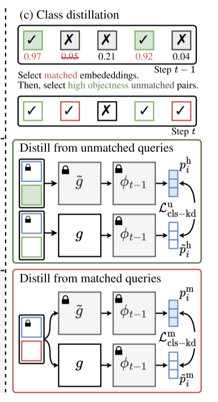 class distillation을 두단계로 나눌 수 있다. (1) GT와 matching되지 않는 이전 단계의 높은 objectness embedding의 class 예측을 distilling (2) matching되는 embedding의 class knowledge를 distilling