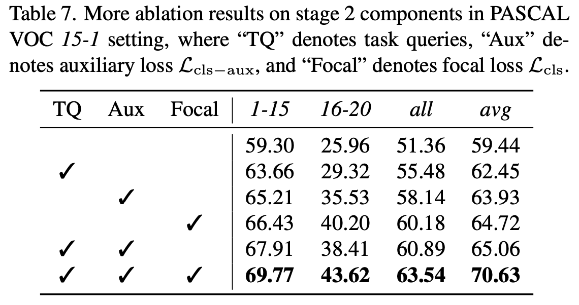 Stage 2는 mask proposal의 object를 인식하는 것이 목표이다. 이를 위해 pixel embedding과 매칭된 positional embedding을 입력으로 사용한다. 또한 task query를 함께 입력하여 task specific classifier를 수행한다. 이를 통해 task interference를 감소시켜 더욱 특화된 classifier를 만들어 continual learning을 잘 수행할 수 있게 한다.