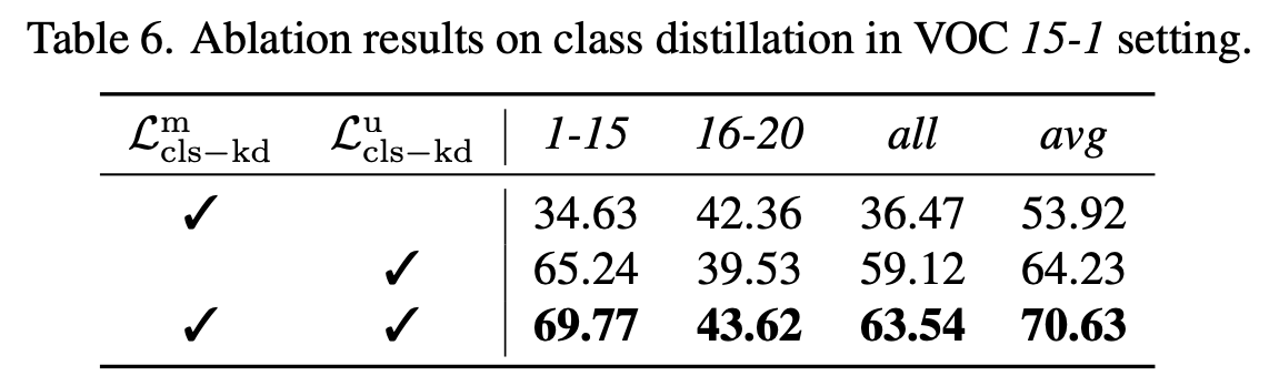 현재 단계와 이전단계의 class probability간의 KL divergence를 최소화하여 old class의 pseudo labeling을 비슷하게 하는 방법이다. 이전단계의 matching되지 않는 embedding이 주어지면, 임계값을 초과하는 n개의 높은 objectness socre를 가지는 embedding을 선택한다. 현재의 embedding 또한 선택한다. class decoding 후 이전 단계의 class logit과 현재 단계의 class logit을 획득한다. 두 단계의 KL divergence를 계산하여 knowledge distillation loss를 줄이고 old class의 robability를 강화한다.