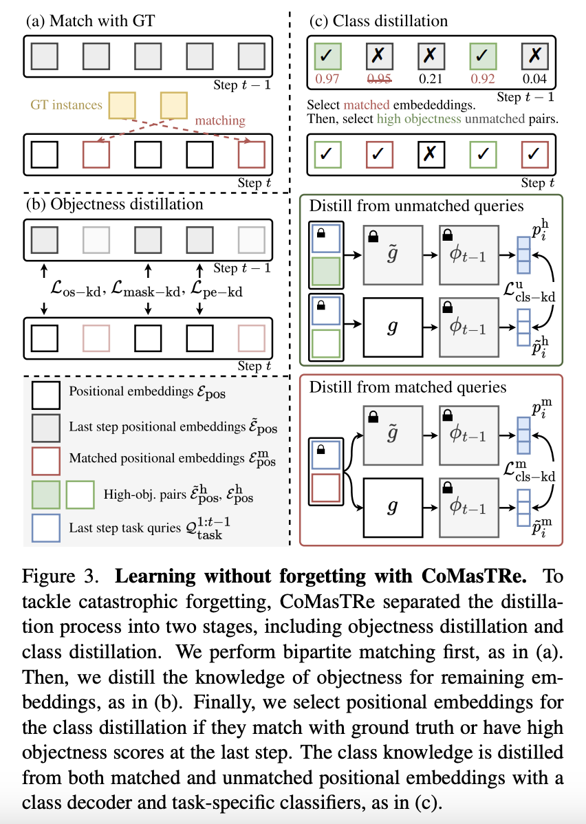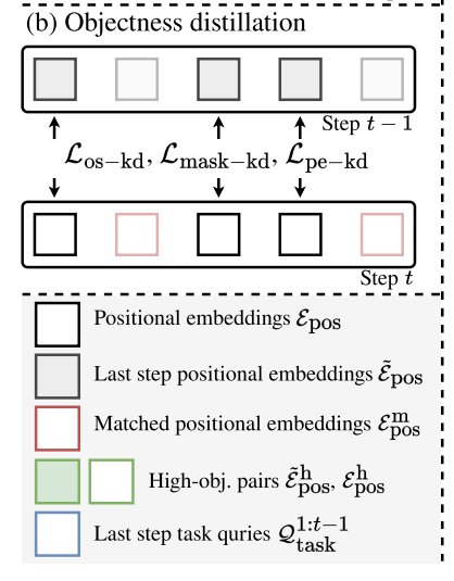 Fig. 3(a)와 같이, bipartite matching을 통해 학습하고, matching된 positional embedding과 matching되지 않는 positional embedding을 얻게 된다. 하지만, matching되지 않는 embedding의 objectness score는 빠르게 줄어든다. GT가 old class의 mask를 포함하지 않고 그 결과 old class의 objectness score가 정확하지 않기 때문이다. 따라서, 이전단계의 objectness score를 유지하기 위한 objectness score distilllation을 제안한다. 또한 objectness를 더 향상시키기 위해 mask proposal, positional embedding에 대한 2가지의 distillation loss를 제안한다.