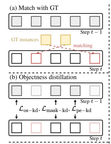 현재 matching되지 않은 objectness score와 마지막 단계의 objectness socre간의 Kullback-Leibler(KL) divergence를 최소화함으로써 object ness score가 줄어드는 것을 완화하기 위해 vanilla knowledge distillation loss를 사용한다.