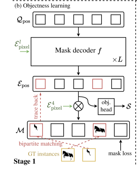 2. 무작위로 초기화된 qeuery를 objectness learning의 입력으로 사용한다. positional embedding을 추출하기 위해 mask decoder f를 사용하여 class agnostic mask proposal M과 objectness score S를 예측한다. GT와 Bipartite Mathcing을 이용하여 학습한다.