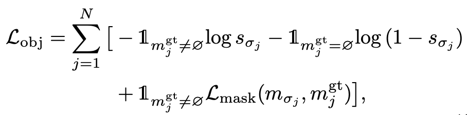 각 positional embedding은 mask proposal을 생성한다. 동시에 positional embedding은 objectness head에 입력되며, binary classifier는 objectness score를 출력하며, 이는 mask proposal이 object을 포함하는지 포함하지 않는지를 나타낸다. 학습동안 bipartite matching을 수행하여 N개의 mask proposal과 M개의 GT간의 cost를 계산한다. N >> M이라고 가정하고 예측과 GT간의 1:1 매칭을 보장하기 위해 no object인 GT pad를 추가한다. Hungarian 알고리즘을 통해 matching을 수행한 후 N개 요소의 최적 순열을 획득해 σ로 지정한다.