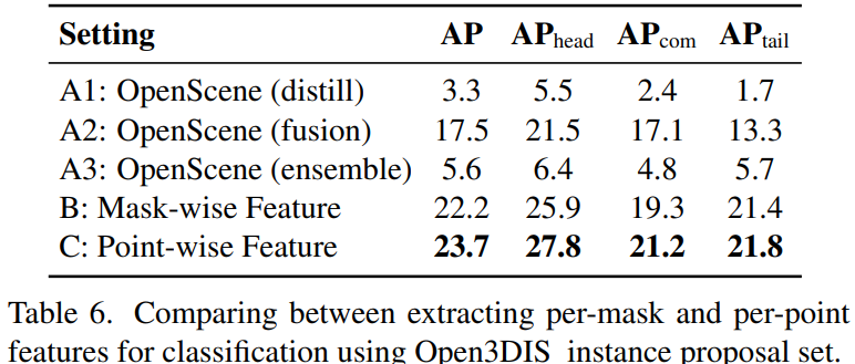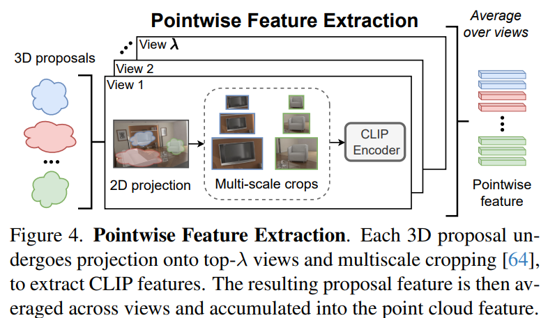 마지막으로 각 3D object proposal의 feature vector를 계산한다. 각 proposal feature vector는 CLIP의 text prompt와 비교하는 것과 같은 instance based task를 수행한다. 이전의 방법들과 달리, 3D aware 전략을 사용한다. point cloud의 feature vector를 동반하여 각 point가 각 view에서 얼마나 자주보이는지를 고려한다. 즉 상위 view에서 더 자주 볼 수 있는 point들이 proposal feature vector에 더 많이 기여해야 한다는 것이다.