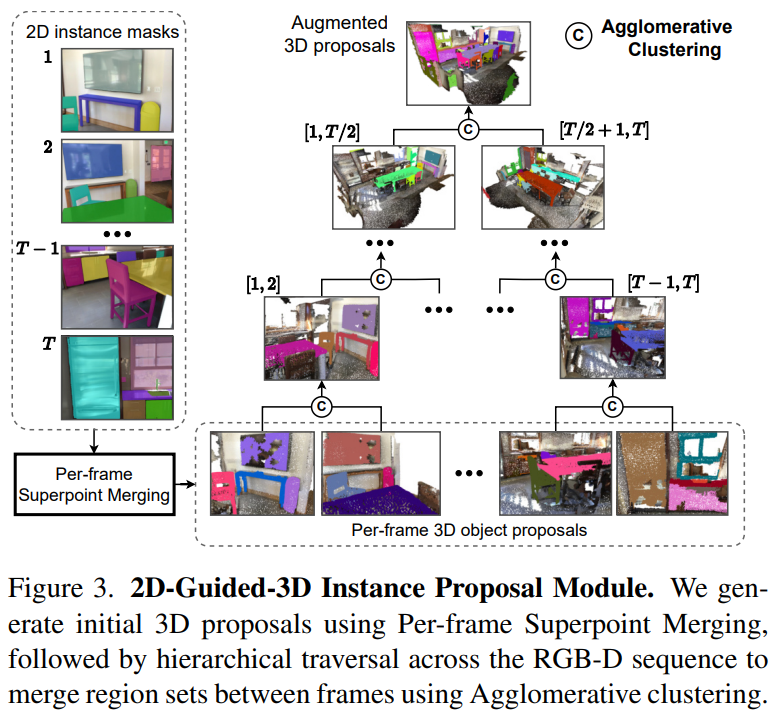 2D instance segmentation을 이용한 2D guided 3D instance proposal module을 활용한다. 하지만 2D mask는 occlusion때문에 3D object의 part만 포착할 수 있다.(Figure 2-2) 이를 해결하기 위해 같은 object의 2D mask를 back project한 point cloud 영역을 계층적 통합을 하는 방식을 제안한다. robust하게 하기 위해, superpoint를 사용한다.