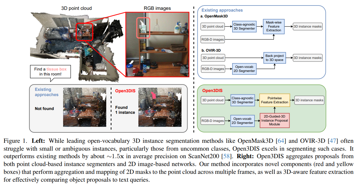 open vocabulary 3D instance segnetation을 다루는 연구가 몇개가 있다. 최근 대부분 pre-train된 3DIS model을 사용하여 3D point cloud의 기하학적 구조를 파악하고 높은 queality의 instance mask를 생성한다. 하지만 이는 rare한 object의 인식이 어려운데 불완전한 appearance의 3D point cloud와 pre-train 3D model의 제한된 detection 능력 때문이다. 또 다른 방법으로 2D off-the-shelf open vocabulary model을 활용하는 것이다. 하지만 2D를 3D point cloud로 전환하는 것은 어려운 일이다. 2D는 3D의 보이는 부분만 포착하고, 배경과 같은 관련없는 영역까지 포함된다. 이는 Figure 1에 요약되어있으니 참고하면 된다.