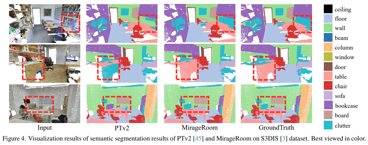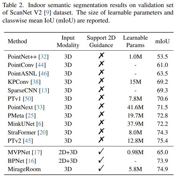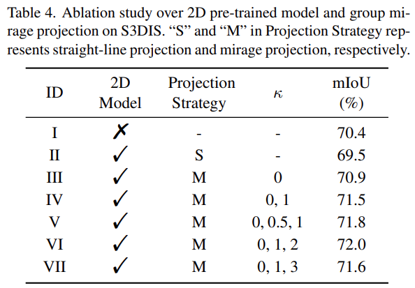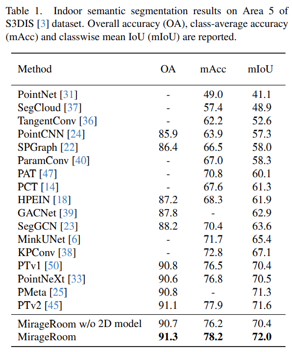 2D pre-train된 모델을 활용한 point cloud segmentation architecture인 MirageRoom을 제안한다. 일직선으로 projection하여 많은 occlusion을 발생시키는 기존의 projection방법들과 다르게 mirage projection을 통해 왜곡된 ray를 활용하여 occluded object를 활용할 수 있다. 이렇게 projection된 image는 더 많은 point를 cover할 수 있고 풍부한 2D feature를 제공한다.