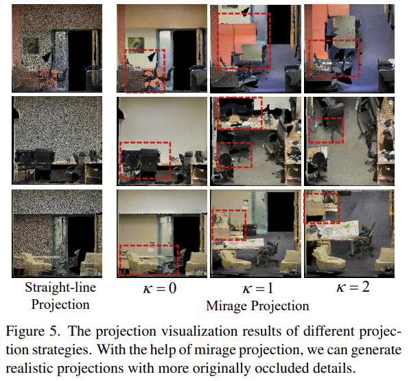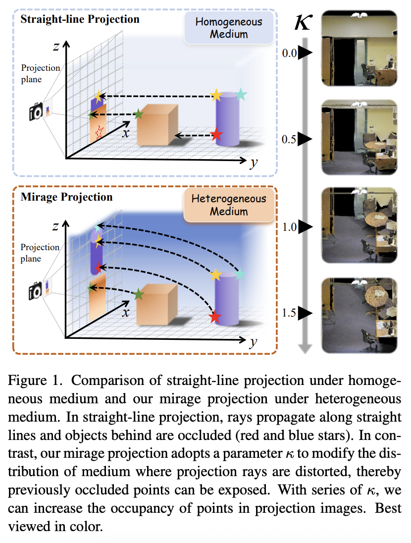본 논문에서 균일한 매질이라는 가정이 있기 때문에 projection ray가 일직선으로 나아가 occlusion이 발생한다고 주장한다. 이질적인 매질에서 왜곡되는 ray를 통해 occluded object를 파악할 수 있는 mirage 현상(신기루 현상)에서 영감을 받아, 왜곡되는 ray를 통해 occluded point를 획득하기 위한 mirage projection 전략을 제안한다. Figure 1과 같이 projection ray를 curve시키는 κ 파라미터를 설정하여 이질적인 매질의 3D 공간을 설계한다. κ를 선택함에 따라 projection image는 더 많은 point를 ocver 한다.