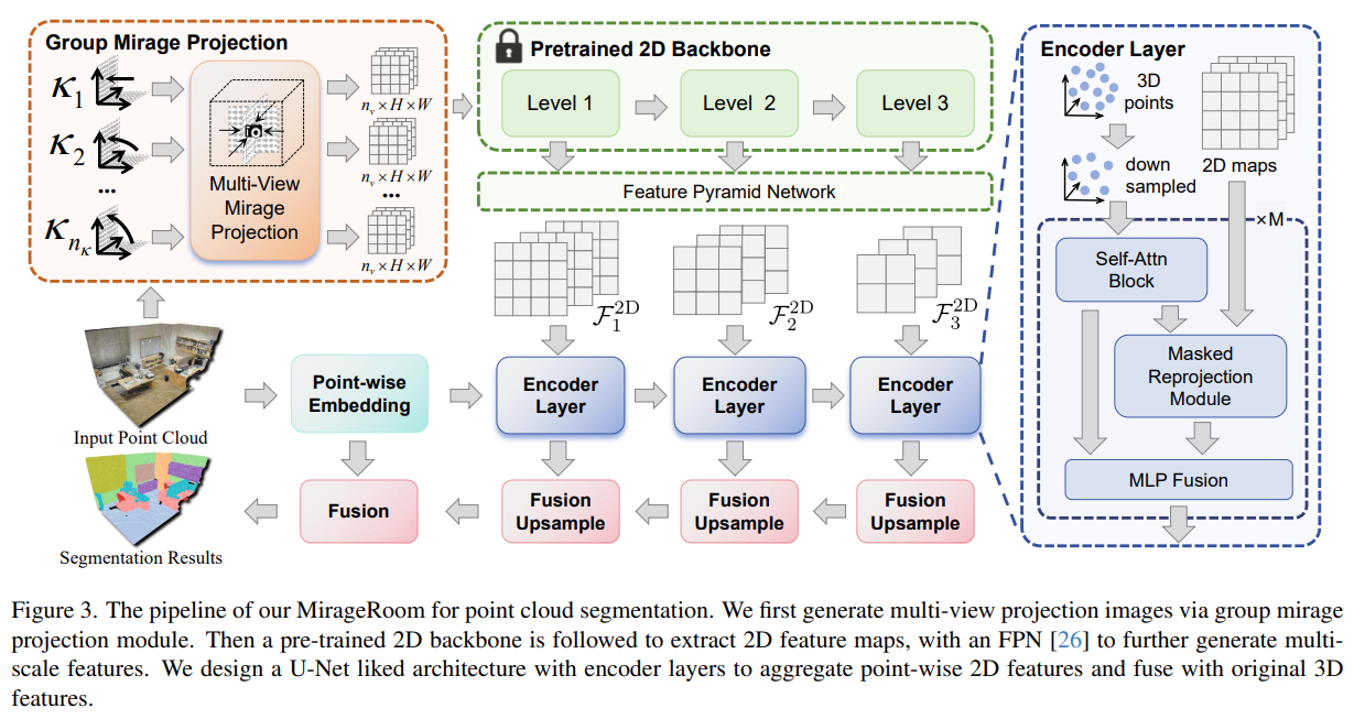 projection 전략을 기반으로, 2D pre-train된 모델를 합친 point cloud architecture인 MirageRoom을 설계한다. κ개의 multi view projection을 그룹화하여 2D model의 정보를 획득한다. 이를 통해 2D image backbone은 2D feature를 추출할 수 있다. 2D와 3D laten space의 차이를 줄이기 위해 masked reprojection module을 설계한다.