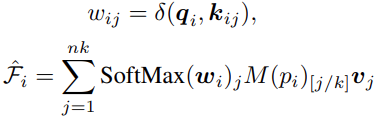 query와 key간의 관계는 두 벡터의 차이로 계산하며, softmax를 적용하여 계산한다. 각 점 point에 대해 projection한 2D feature가 유효한지 mask를 통해 확인 후 최종 계산한다.
